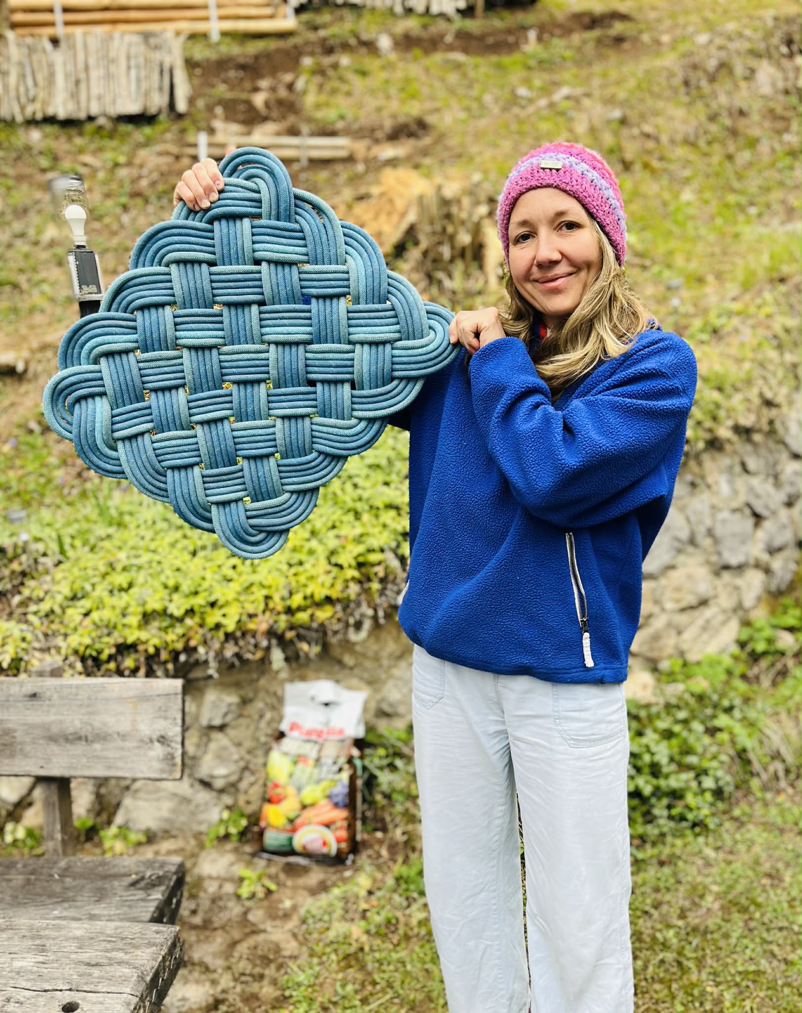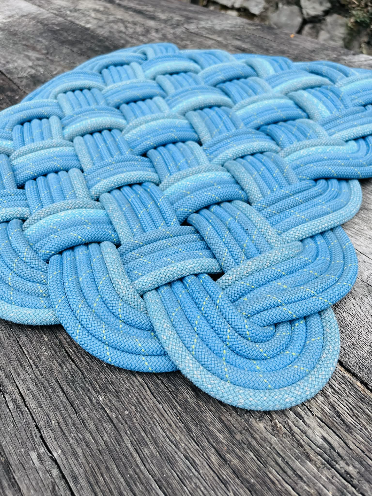 Ta barvit predpražnik, izdelan iz odslužene plezalne vrvi, združuje funkcionalnost in trajnost. Z dimenzijami 42 cm x 52 cm je idealen za manjše prostore ali kot dekorativen dodatek. Njegova unikatna tekstura in živahne barve prinašajo svežino in pridih pustolovščine v vsak dom, hkrati pa ponosno predstavlja trajnostno uporabo materialov, ki bi sicer končali kot odpadki.